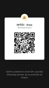 Nacionalni panožni šolsko - športni center | NPŠŠC PREDSTAVITEV PROGRAMA Predstavitev NPŠŠC - alpsko smučanje Pot do izobrazbe Predstavitev Gimnazija Franceta Prešerna Kranj Program na GFP Predstavitev Dijaški in študentski dom Kranj KR v DŠD Whatsapp skupina NPŠŠC Zainteresiranim staršem bodo dodatne in ključne informacije na voljo v WHATSAPP skupini NPŠŠC Kranj. Povezava v skupino s QR kodo ali povezavo. Arhiv